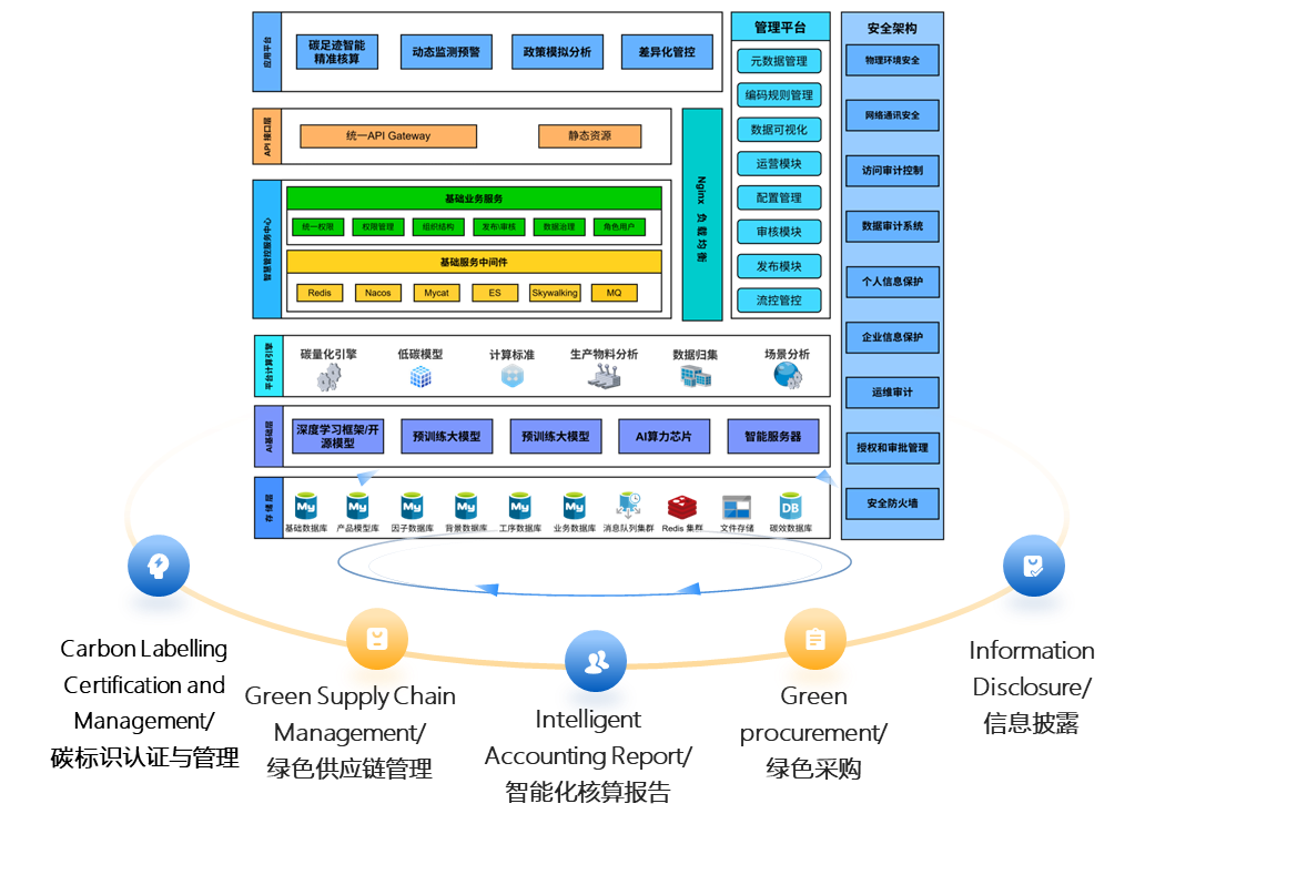 平臺開發(fā)采用高起點設(shè)計、高標(biāo)準(zhǔn)實施,在六大維度實現(xiàn)突破:背景數(shù)據(jù)本土化,結(jié)合我國能源結(jié)構(gòu)與產(chǎn)業(yè)特征,通過制定行業(yè)碳足跡量化標(biāo)準(zhǔn)、調(diào)研收集現(xiàn)場數(shù)據(jù),構(gòu)建了涵蓋基礎(chǔ)能源、原材料、運輸、廢棄物處理等上萬條本土化數(shù)據(jù)集;數(shù)據(jù)開發(fā)規(guī)范化,建立了統(tǒng)一的數(shù)據(jù)采集、處理、審核、入庫標(biāo)準(zhǔn),確保數(shù)據(jù)可審計、可追溯、可互聯(lián);數(shù)據(jù)更新動態(tài)化,通過多節(jié)點嵌套+循環(huán)引用的碳流閉環(huán)建模,實現(xiàn)了數(shù)據(jù)的動態(tài)更新;數(shù)據(jù)結(jié)構(gòu)國際化,兼容ISO、EF、ILCD等國際主流數(shù)據(jù)庫核算方法與格式規(guī)范標(biāo)準(zhǔn)體系,可支持本土數(shù)據(jù)與全球數(shù)據(jù)的互認(rèn)互通;認(rèn)證披露一體化,整合本土背景數(shù)據(jù)庫、智能核算工具、認(rèn)證管理與信息披露系統(tǒng),實現(xiàn)了碳足跡核算、認(rèn)證、管理和信息披露一站式服務(wù);服務(wù)過程智能化,依托AI技術(shù),實現(xiàn)一鍵自動建模、因子匹配、數(shù)據(jù)校驗、報告生成等功能,更有智能化大模型賦能,使服務(wù)過程精準(zhǔn)高效。