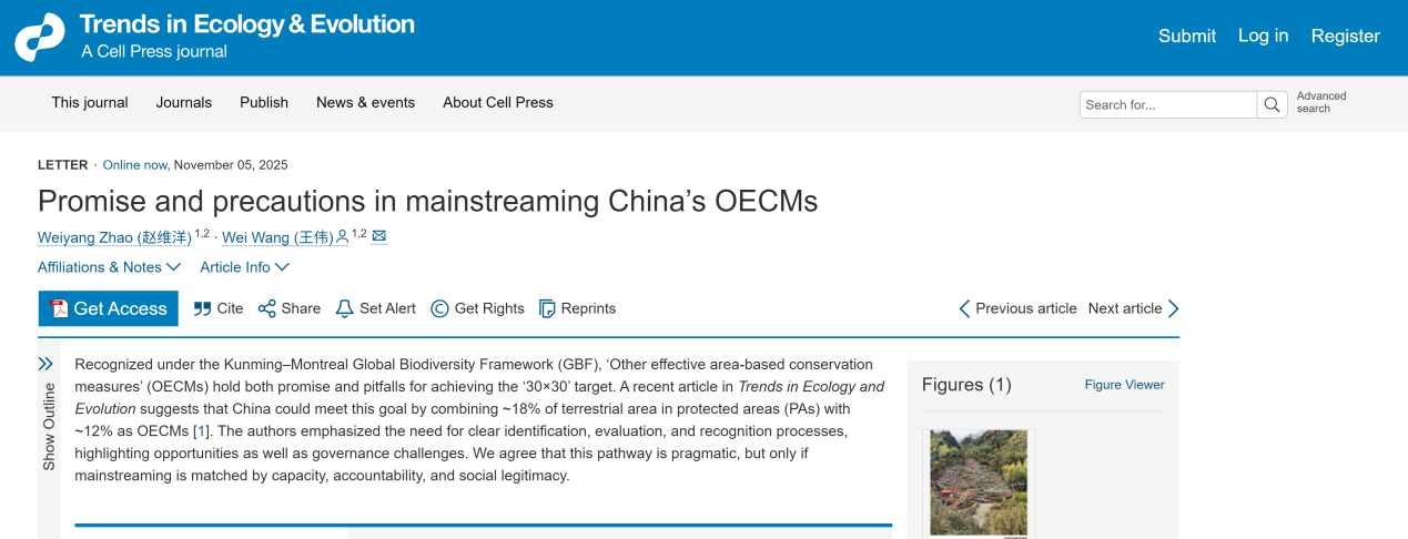 本文于2025年11月在線發表于Cell旗下子刊Trends in Ecology & Evolution(影響因子17.3,生態學科JCR排名第1)。中國環境科學研究院生態所(生態環境部區域生態過程與功能評估重點實驗室自然保護地可持續生態學團隊)趙維洋助理研究員為本文第一作者,王偉研究員為本文通訊作者。本研究得到了中國環境科學研究院中央級公益性科研院所基本科研業務費專項項目的支持。